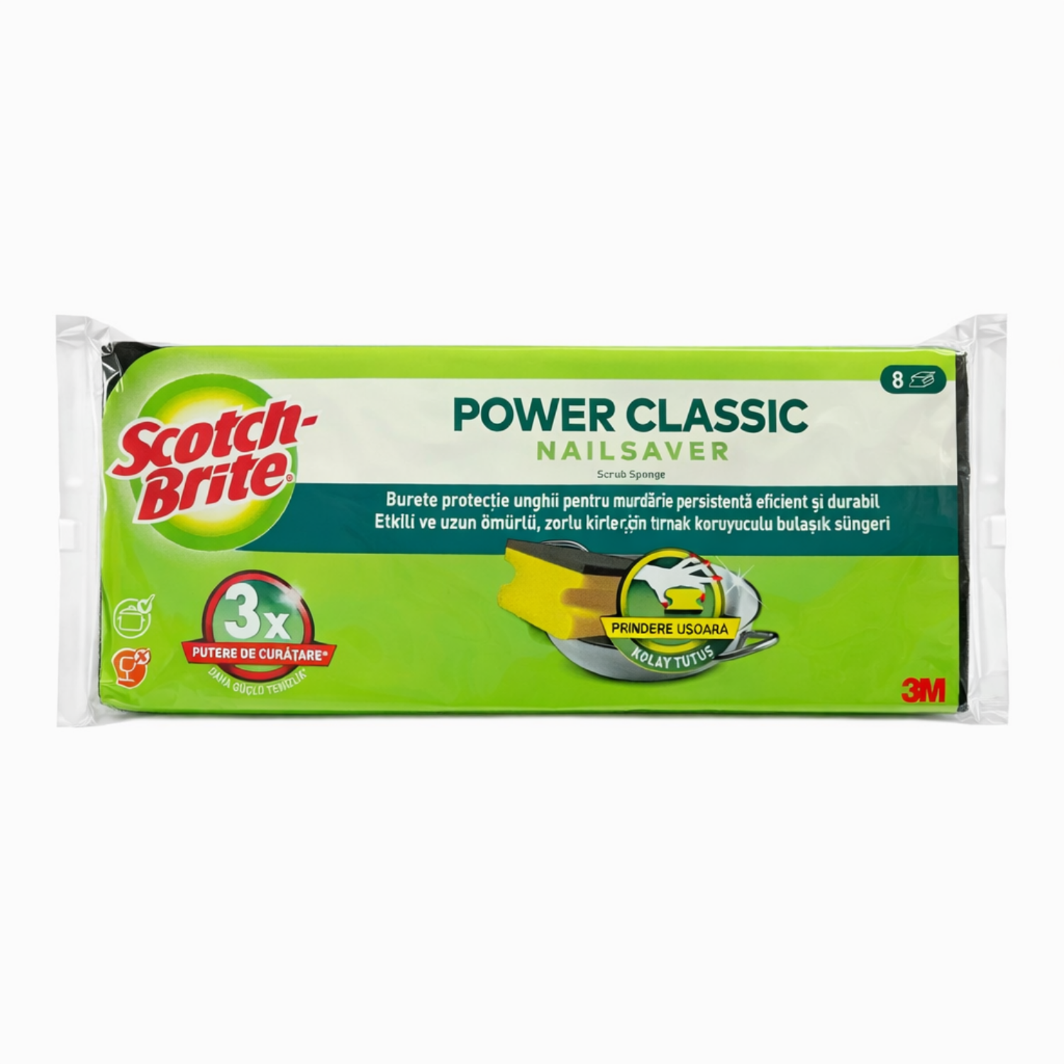 Scotch-Brite Power Classic bulaşık süngeri, zorlu ve inatçı kirlerin üstesinden gelmek için geliştirilmiş bir temizlik ürünüdür. Tırnak koruyuculu tasarımı ile ellerinizi korurken, yağlı ve kurumuş yiyecek kalıntılarını etkili bir şekilde temizler.